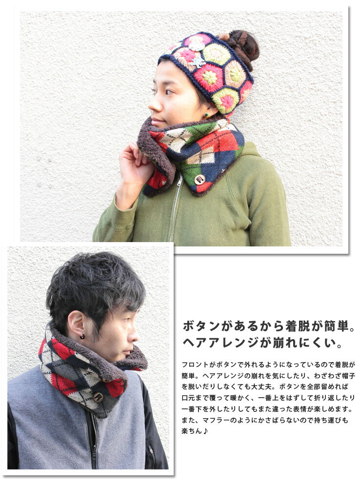 ↓人気ネックウォーマーがボタンつきにバージョンUP!↓ ネコポス可 【他おすすめはこちら】 タイプ アーガイル チェック ボタン付き ネックウォーマー /ボタン ボア ファッション 秋 冬 山登り チェック柄 メンズ レディース ボア 着脱 ニット スノボ バイク スノーボード 登山好評のボタン付ネックウォーマータイプに新しい柄が登場! 秋冬らしい暖かみのあるアーガイル柄を採用!カジュアルにもきちんとにも、レディースにもメンズにも似合うからヘビロテ間違いなし!フロントにボタンをつけて、巻いてボタンを留めるデザインはヘアアレンジを気にしたり、帽子などを脱ぐ煩わしさがなく、ストレスフリー。